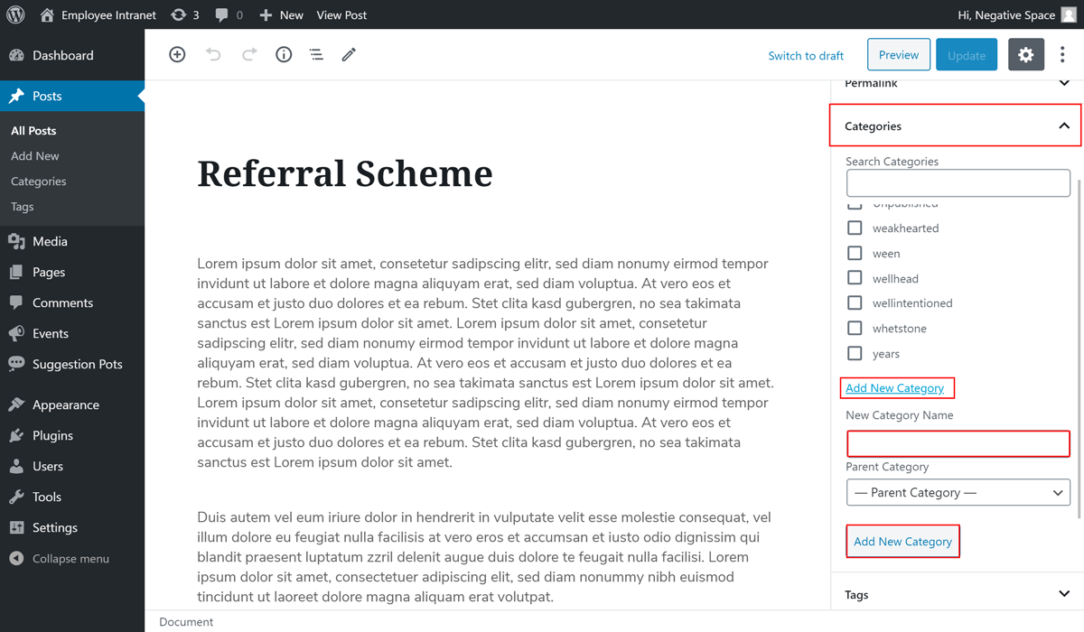 Alternatively, you can add a new category while editing a News article as highlighted below.