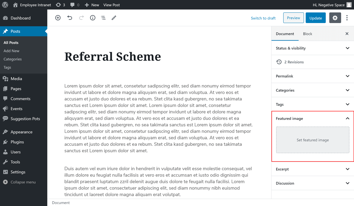 - Expand the Featured image section in the Document tab as highlighted below and click on Set featured image