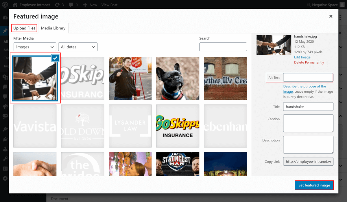 - Select an existing image from the Media gallery by clicking on it, or upload a new image by clicking on the Upload Files tab and following the instructions. It's good practice to add Alt Text to an image to describe the image to visually impaired users. When you're happy with the selection, click on Set featured image.