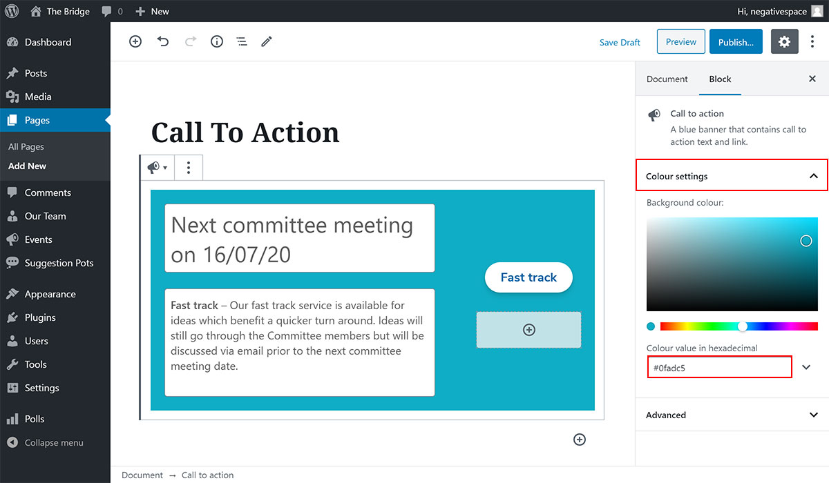 As of Phase 2 of the Intranet, you can customise the background colour of the Call To Action block. To do that, simply: