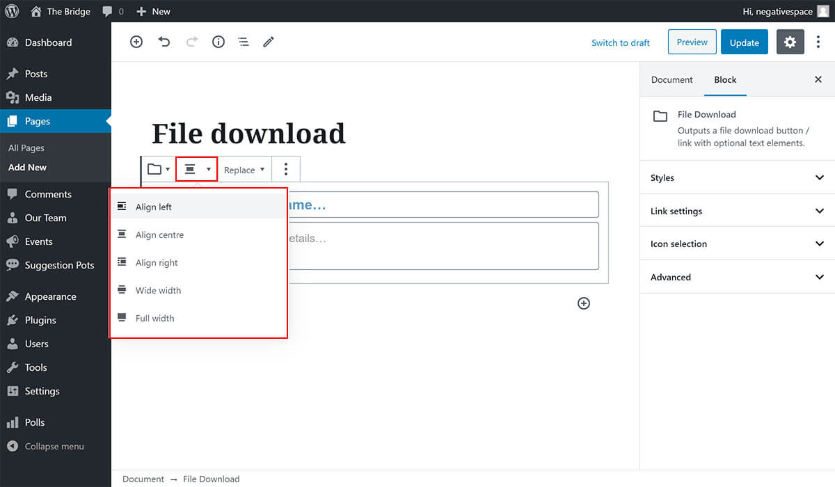 The file download block can be aligned to the left / center / right to allow any paragraph text to wrap around it. In the example below the file download shows the icon only and is aligned to the right and as a result the paragraph text wraps around the file icon.