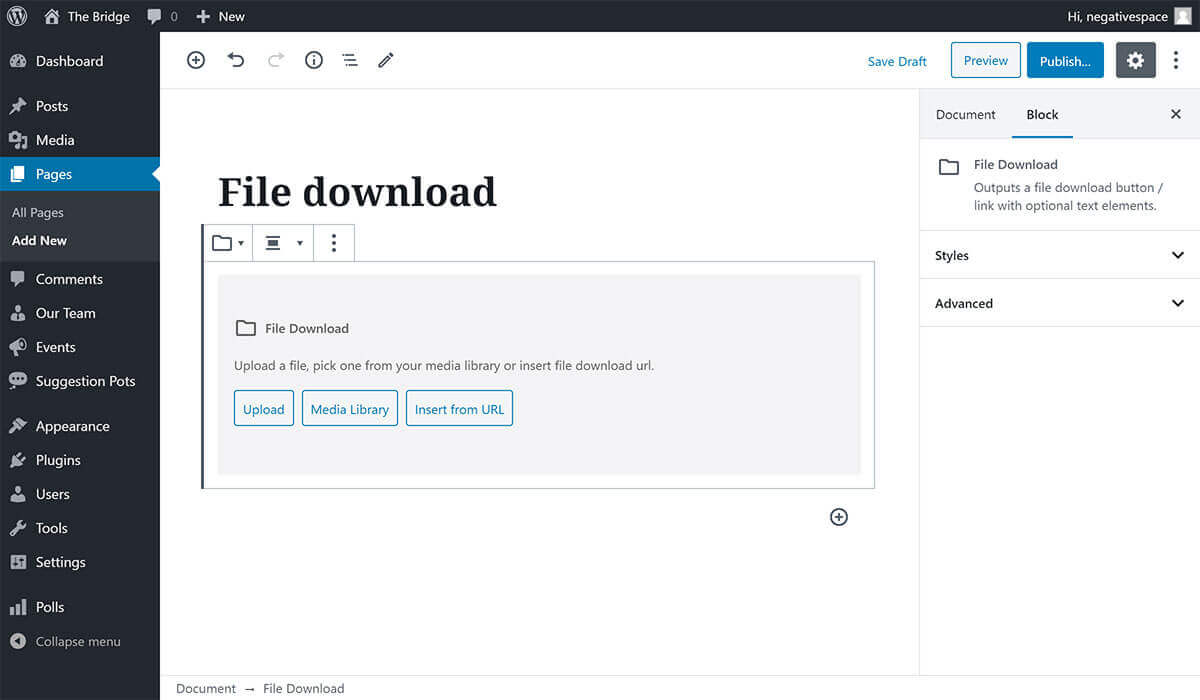Once you add the block you will be prompted to choose a file by either uploading a new one, choosing one from the Media Library or inserting one from a URL as shown below.