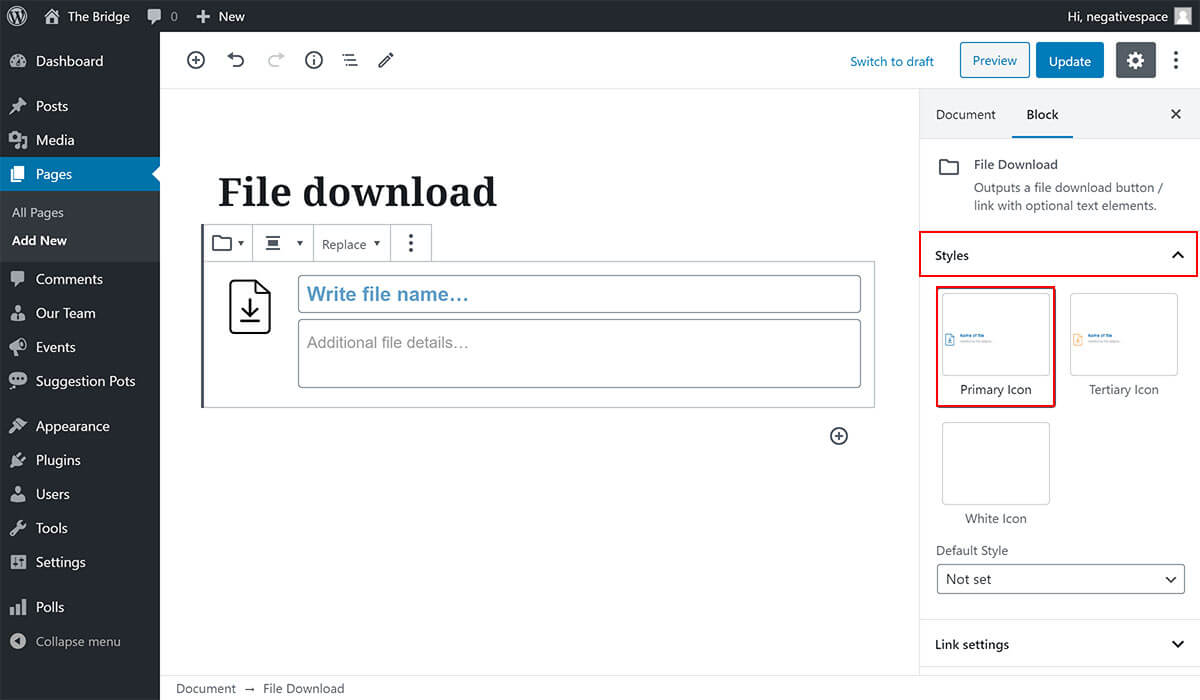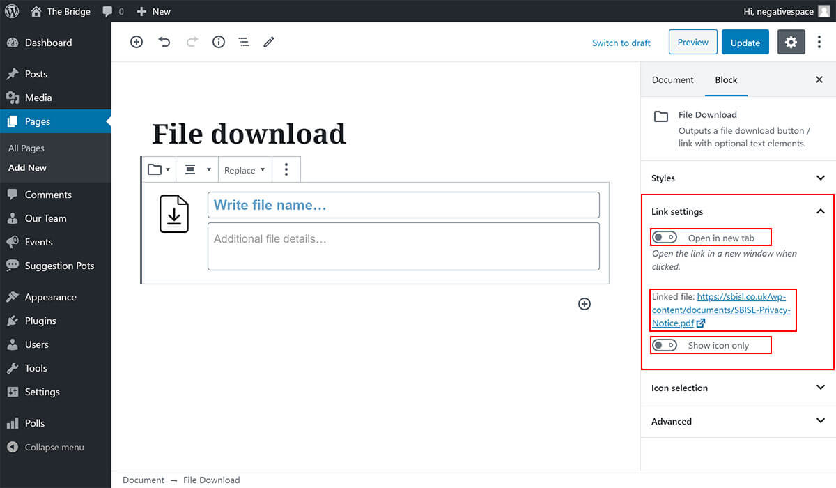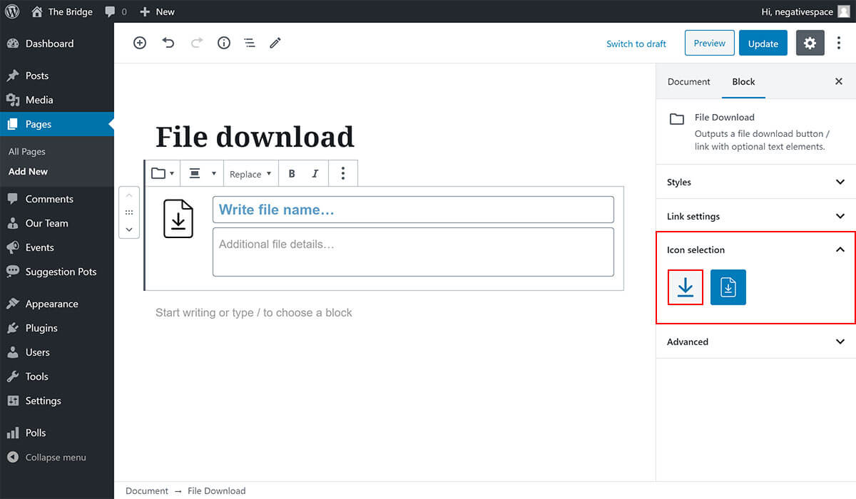 Finally, you can change the File download icon by expanding the Icon selection dropdown (highlighted below) and clicking on one of the predefined ones to select it (highlighted below).