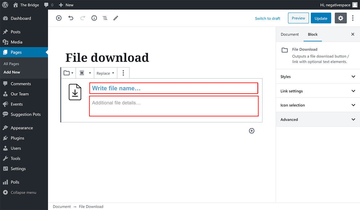 Note: To wrap the file icon with paragraph text the file download block will need to come before the paragraph block in the Gutenberg editor.