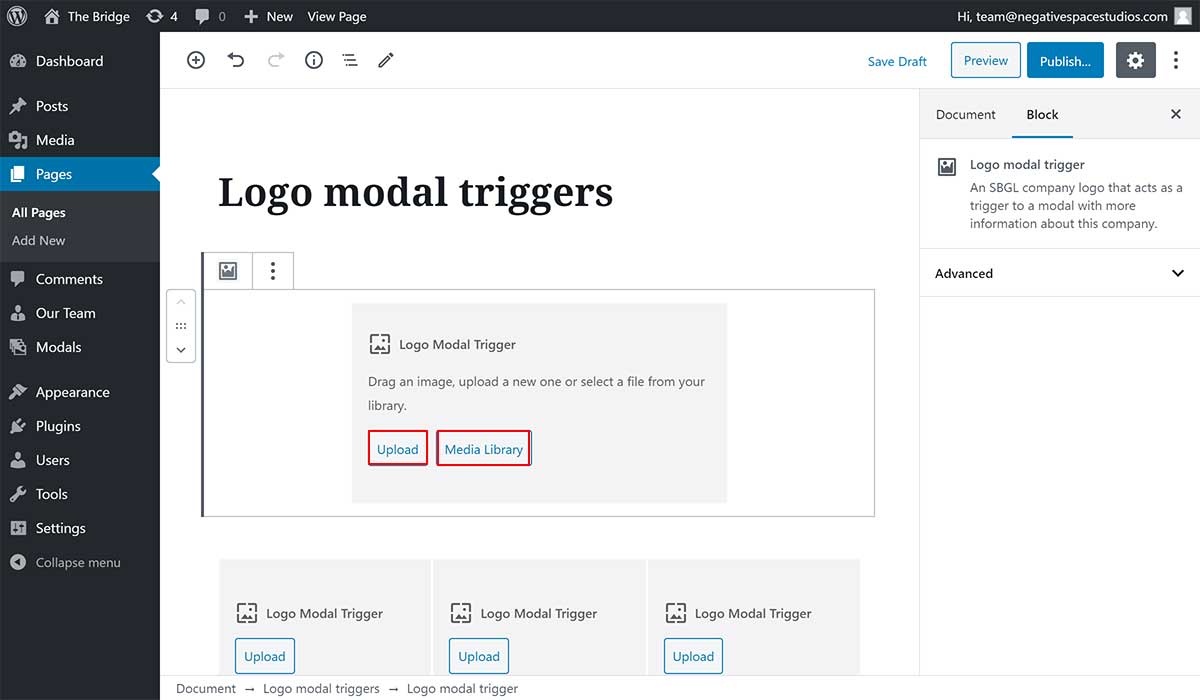 The first step when customising this block is adding a logo that will act as a trigger for a modal. As per the design, the first logo will go to the top of the hierarchy and the following three logos will go under the first logo inline with each other.