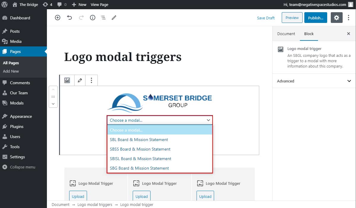 This Gutenberg block comes as part of the SBGL Modals custom plugin and it's used to construct the following logos that trigger individual modals with information about a Somerset Bridge company.