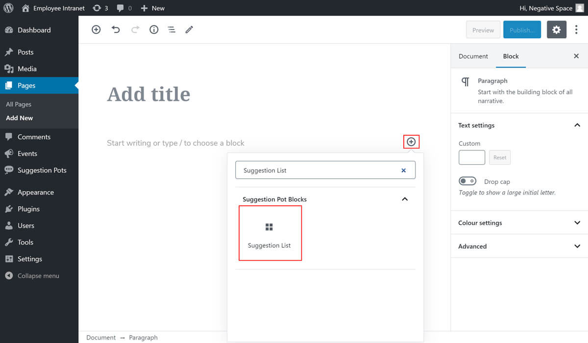 - Find and select the block with the name Suggestion List (highlighted below) and,