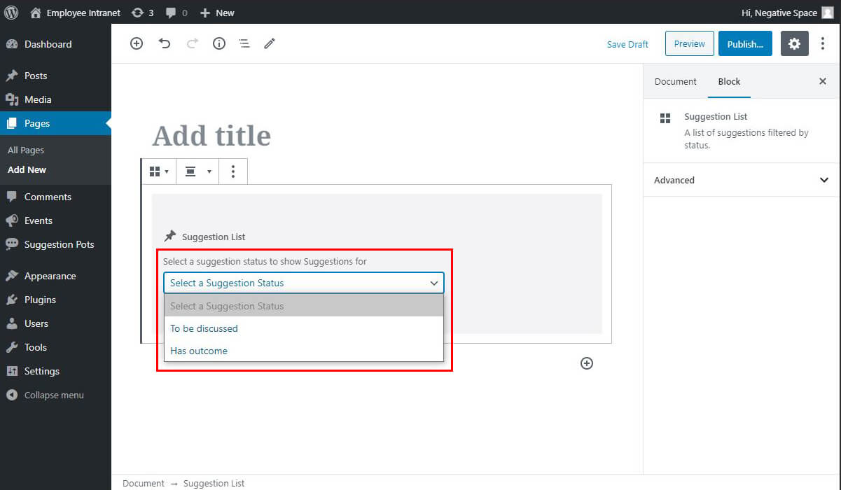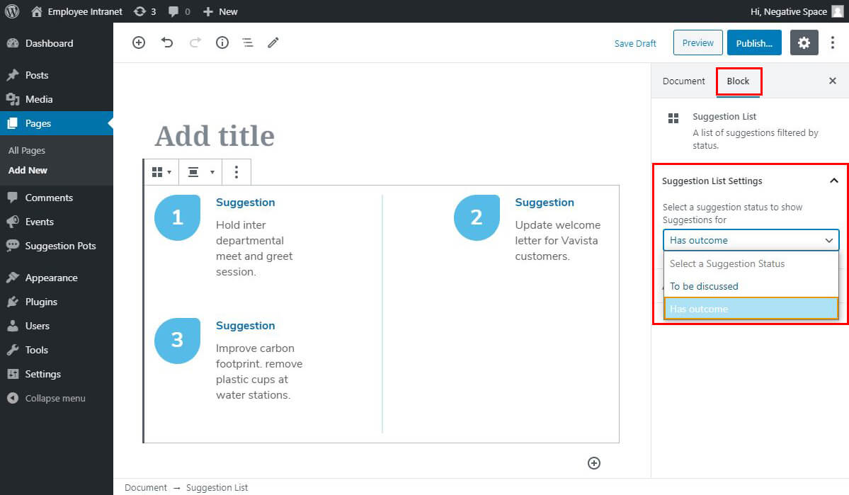 If you ever need to edit the suggestion status, select the Suggestion List block and change the status under Block in the Suggestion List Settings dropdown (highlighted below).