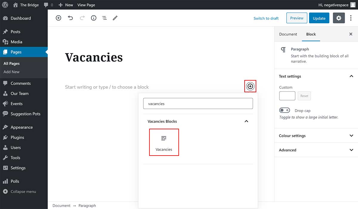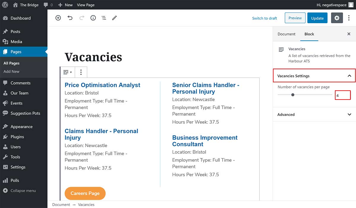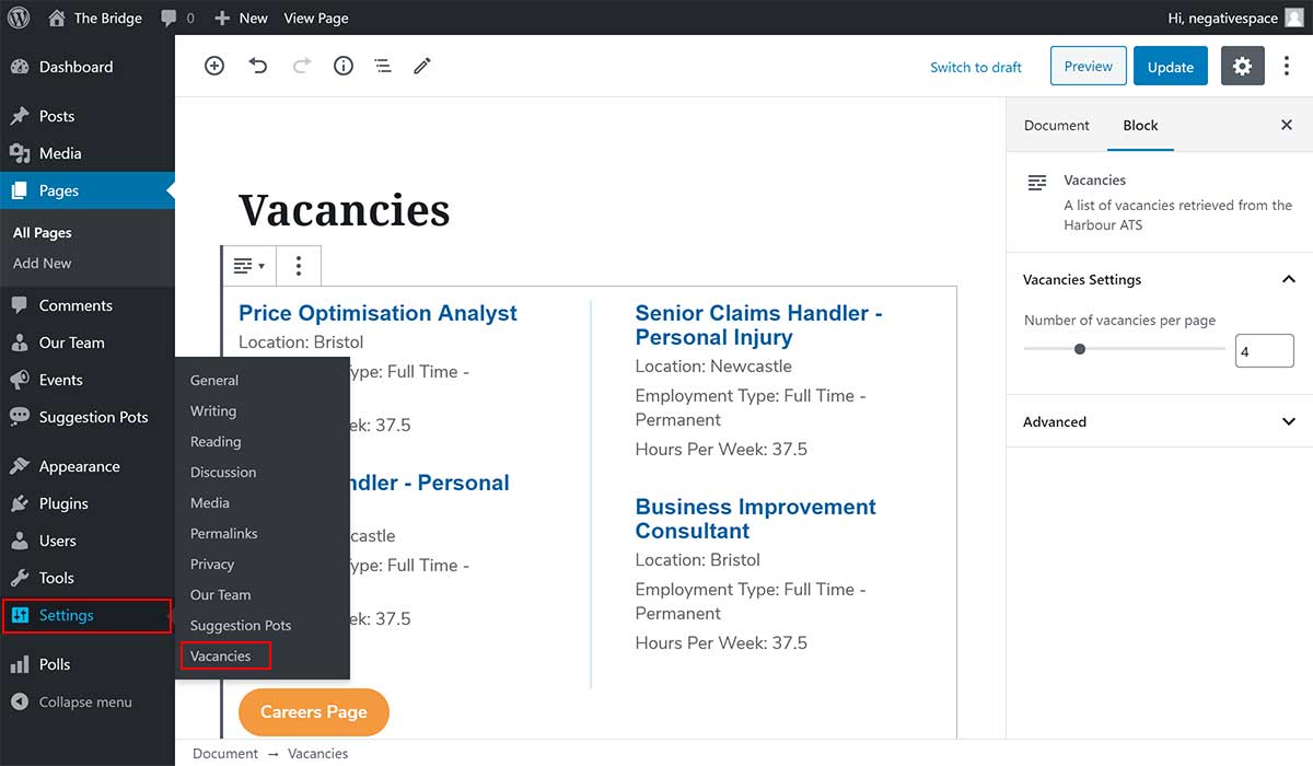 Vacancies is a custom block that integrates with the Harbour ATS jobs feed and returns information and links about the most recent job ads.