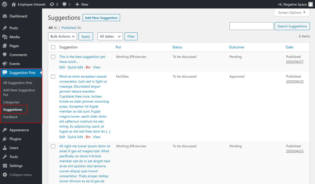 Once a user has submitted a new Suggestion, that Suggestion is automatically stored in the back-end of the site.