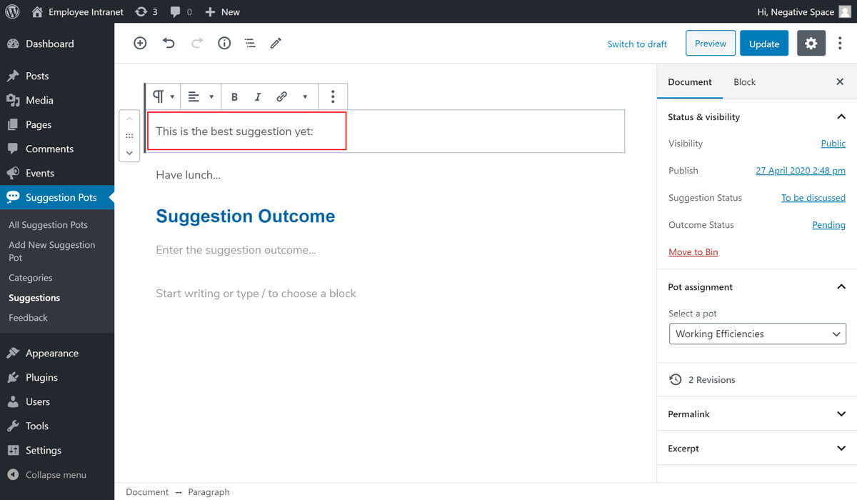 3. A site administrator clicks to edit the Suggestion in the back-end of the site, and:
