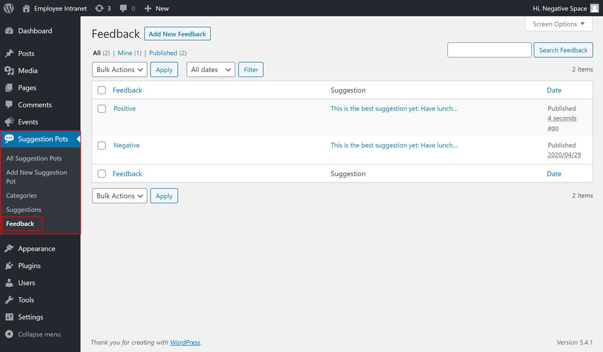 When a user votes for a Suggestion, a Suggestion Feedback item is automatically generated in the back-end of the site that records the vote. To see the votes for a Suggestion: