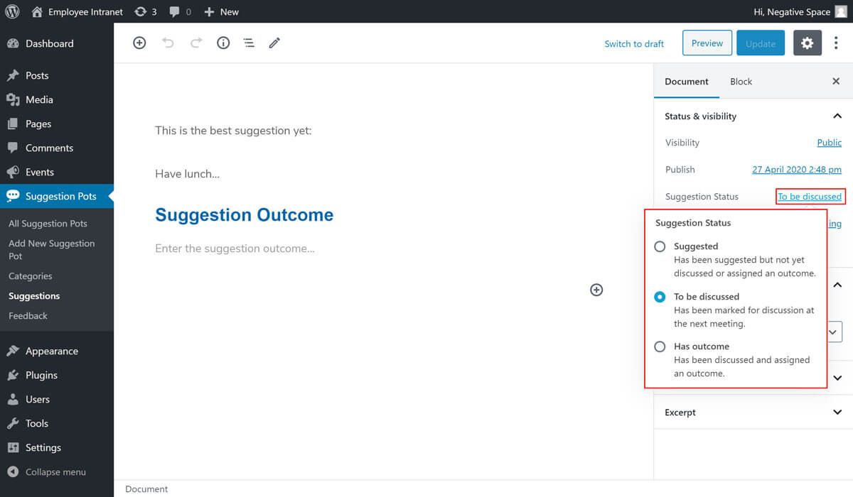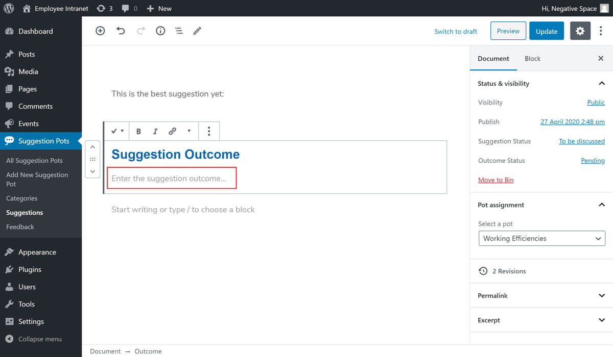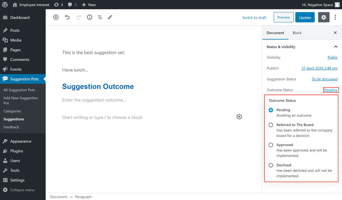 • Change the Outcome Status (e.g. set it to "Approved" if the suggestion has been approved by the board)